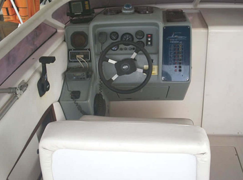 00137 CIMITARRA 25: 1996, vp 5.8 290hp, gasolina, 360hs de uso, 45 top e 33 cruzeiro, rabeta vp dp, âncora, antena de vhf, 2 baterias, bomba de água doce, bomba de porão, bússola, buzina, capota, carreta de encalhe, cd player, chuveiro, coletes, comando eletrônico, direção hidráulico, extintores, flap hidráulico, rádio vhf, sanitário comum, sonda…