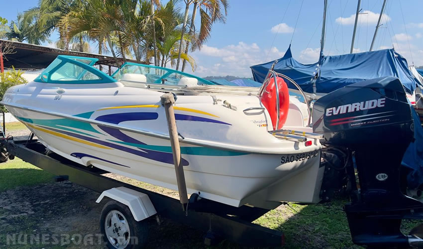 CÓD 0810 FOCKER 190: proa aberta, 2001, evinrude 115hp, gasolina, 260hs de uso, 38 top e 26 cruzeiro, âncora, bateria, bomba de água doce, bomba de porão, bússola, capa, capota, carreta rodoviária, chuveiro de popa, (4) coletes, (2) cooler, extintor…