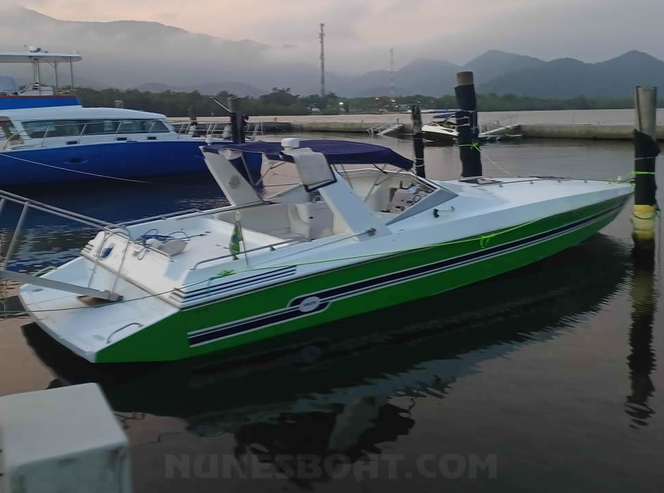 CÓD 6708 MAGNUM 39: 1994, 2x vp kad42 225hp, diesel, 350hs de uso, 39 top e 27 cruzeiro, rabetas vp 295 dp, âncora, baterias, bomba de água doce, bombas de porão, bússola, capota, carregador de bateria, carreta de encalhe, churrasqueira, chuveiro de popa, (12) coletes, defensas, direção hidráulica, extintores, farol, foguetes, geladeira, gps c/plotter, guincho elétrico, inversor, microondas, rádio vhf, sanitário comum, som, tomada de cais, (3) ventiladores…